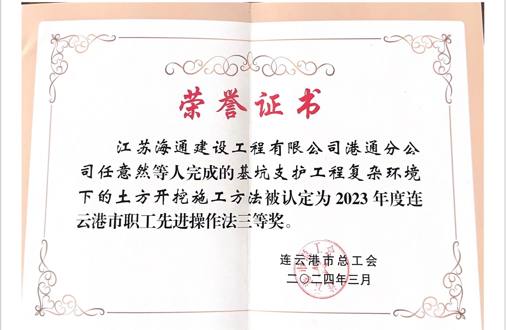 近日,從連云港市總工會傳來喜訊,江蘇海建公司申報的《基坑支護(hù)工程復(fù)雜環(huán)境下的土方開挖施工方法》獲得2023年度職工先進(jìn)操作法三等獎。