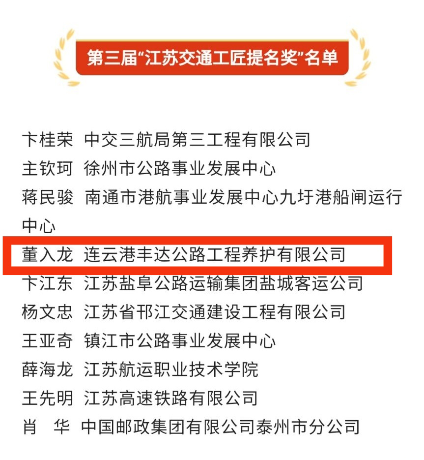近日,江蘇省交通運(yùn)輸廳發(fā)文公布第三屆“江蘇交通工匠”名單。連云港豐達(dá)公路工程養(yǎng)護(hù)有限公司道路施工項(xiàng)目部經(jīng)理董入龍榮獲“江蘇交通工匠提名獎(jiǎng)”。