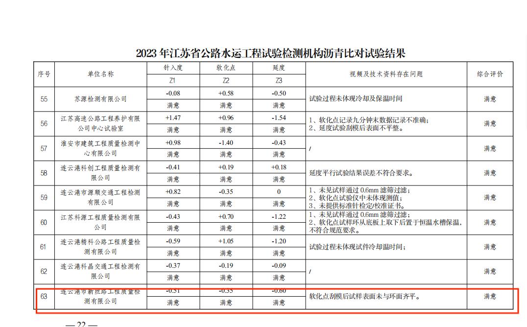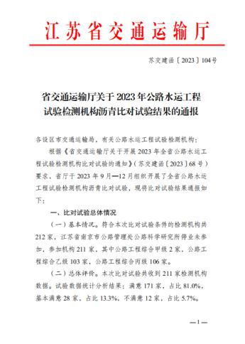日前,江蘇省交通運(yùn)輸廳組織開展了全省公路水運(yùn)工程試驗(yàn)檢測機(jī)構(gòu)瀝青比對試驗(yàn),江蘇海建新絲路檢測公司高度重視,認(rèn)真參與。近日,根據(jù)蘇交建函〔2023〕104號發(fā)文通報,公司在此次比對試驗(yàn)中結(jié)果為“滿意”。