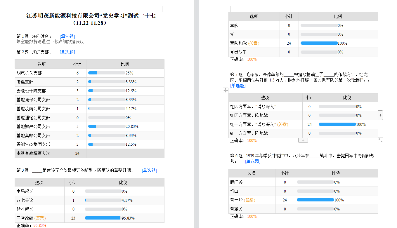 為深入開展黨史學(xué)習(xí)教育,創(chuàng)新黨史知識學(xué)習(xí)的方法和途徑,營造更加濃厚的學(xué)習(xí)氛圍,讓黨史學(xué)習(xí)教育“活”起來,明茂公司積極拓寬黨史學(xué)習(xí)渠道,強化學(xué)習(xí)覆蓋面和參與度,創(chuàng)新理論學(xué)習(xí)方式,以一部手機(jī)為依托每周開展微信黨史線上答題測試,通過融入知識性、趣味性、便捷性為一體的知識測試,及時跟蹤個人測試情況,利用碎片時間,隨時隨地檢驗學(xué)習(xí)成果,截止目前已開展28期。