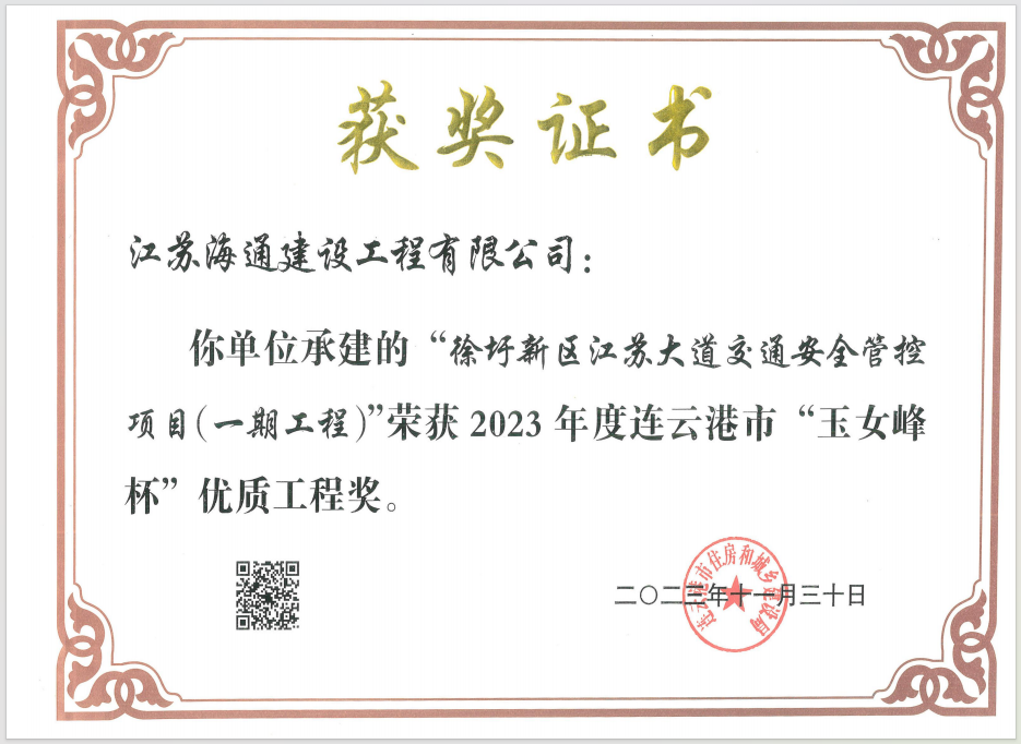 近日,從連云港住房和城鄉(xiāng)建設局獲悉,江蘇海建公司徐圩新區(qū)江蘇大道交通安全管控項目(一期工程)榮獲2023年度連云港市“玉女峰杯”優(yōu)質工程獎。