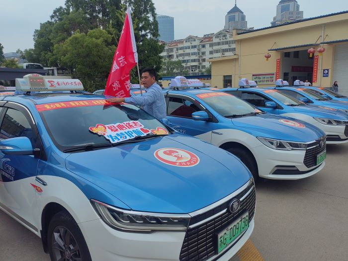 儀式現(xiàn)場,30余輛愛心送考出租車統(tǒng)一張貼了“愛心助考,乘風(fēng)破浪;金榜題名,未來可期”的標(biāo)識,志愿者們精神抖擻、整裝待發(fā)?!袄卒h的士”車隊隊長黃仁杰代表愛心送考出租車駕駛員作表態(tài)發(fā)言,他呼吁廣大志愿者們進(jìn)一步展現(xiàn)交通人良好形象,傳遞社會正能量,遵守交通秩序,用愛心用真情助力莘莘學(xué)子金榜題名。隨后,鄧志強、李樹軍共同為“愛心送考”車隊代表授旗;鞠仕亮還就近年來“愛心送考”活動組織開展情況作了匯報。