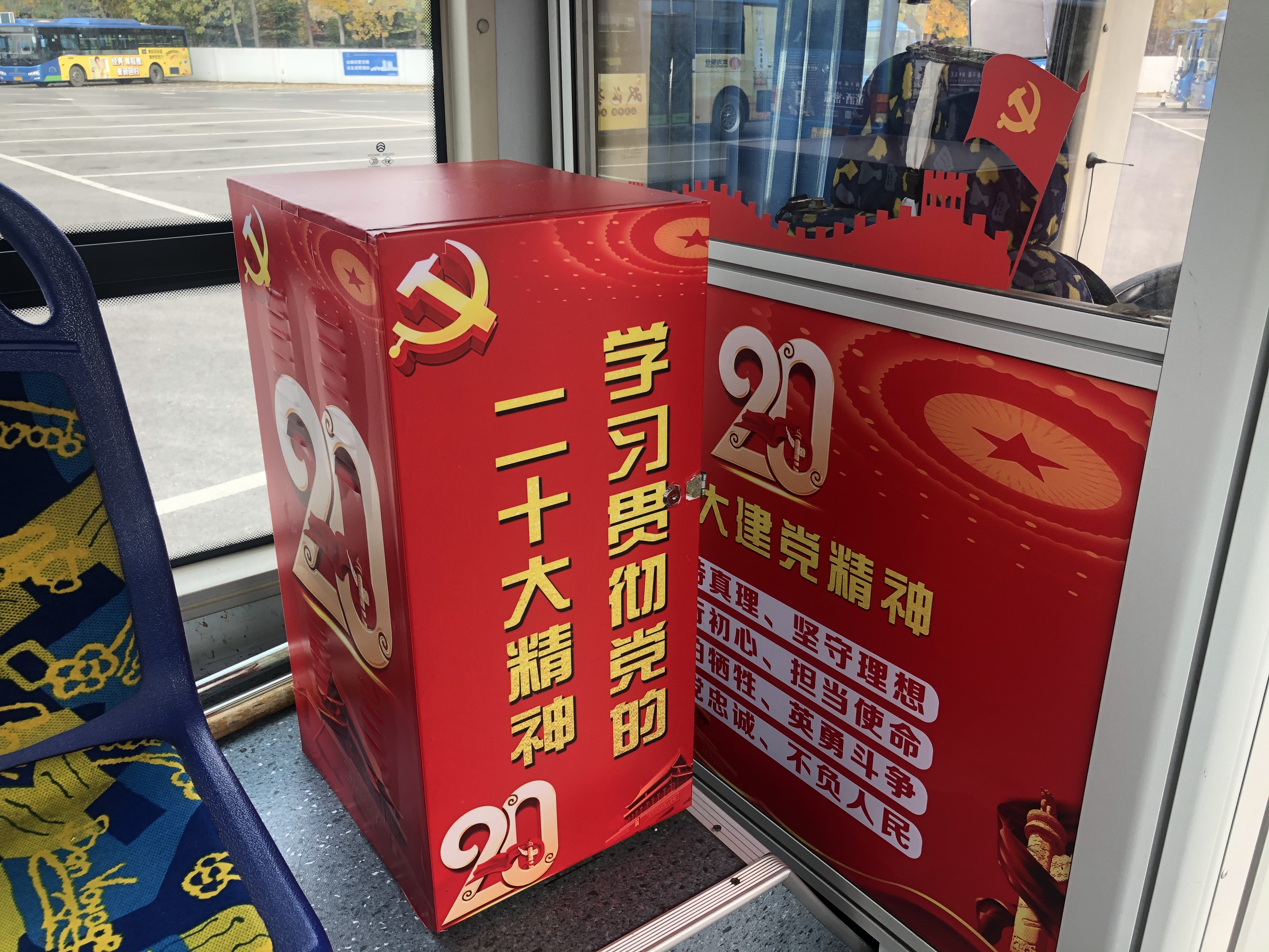 在暨2021年建黨百年“紅色黨史”主題車廂的基礎(chǔ)上,今年公交事業(yè)一部黨支部緊緊圍繞黨的二十大為宣傳主線,充分結(jié)合當前工作實際,在持續(xù)深化黨史學習教育的同時,以公交20路為紅色宣傳載體再發(fā)力,分別將車身廣告及車內(nèi)展板進行更新升級,以黨的二十大報告為主要宣傳內(nèi)容,打造了主題會議型車廂。