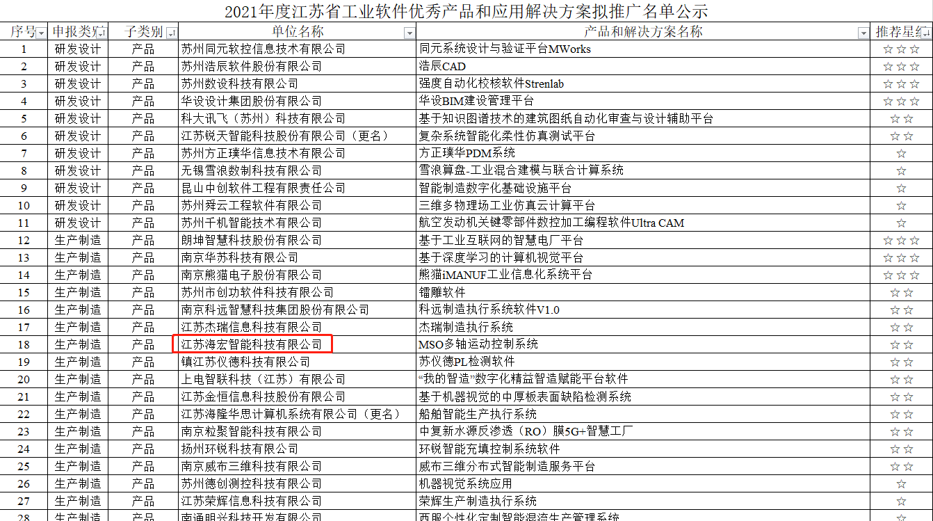日前,江蘇省工信廳公示了“2021年度江蘇省工業(yè)軟件優(yōu)秀產(chǎn)品和應(yīng)用解決方案擬推廣名單”,江蘇海宏智能科技有限公司(以下簡稱“海宏科技”)的產(chǎn)品“MSO多軸運(yùn)動控制系統(tǒng)”成功入選。