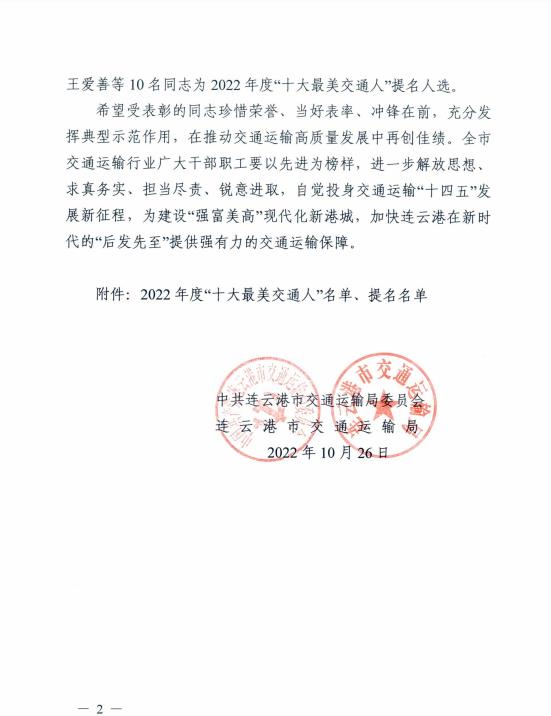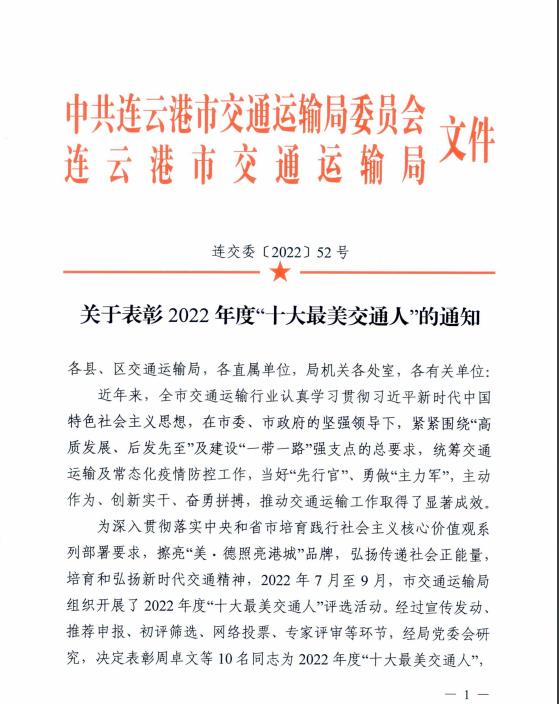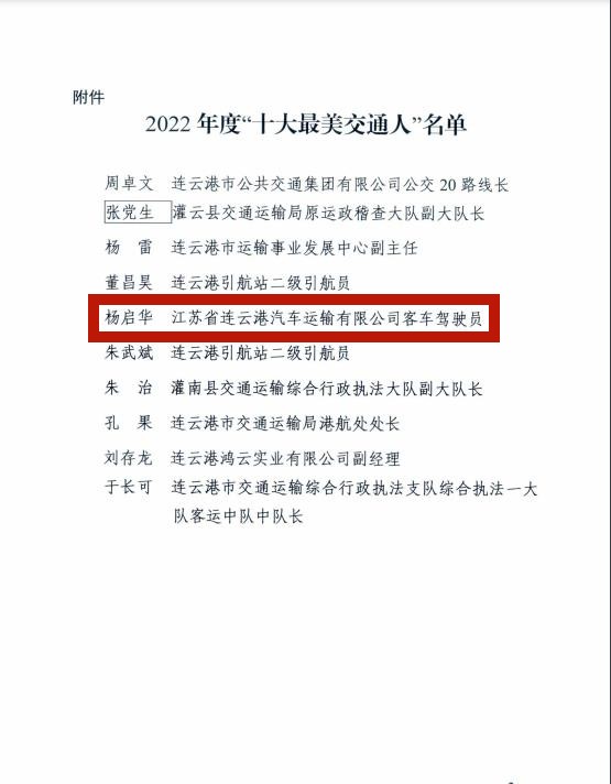 為深入貫徹落實中央和省市培育踐行社會主義核心價值觀系列部署要求,擦亮“美·德照亮港城”品牌,弘揚傳遞社會正能量,培育和弘揚新時代交通精神,2022年7月至9月,市交通運輸局組織開展了2022年度“十大最美交通人”評選活動。經(jīng)過宣傳發(fā)動、推薦申報、初評篩選、網(wǎng)絡(luò)投票、專家評審等環(huán)節(jié),汽車公司客車駕駛員楊啟華勇于擔(dān)當(dāng)、無私奉獻(xiàn),為推動交通運輸高質(zhì)量發(fā)展做出了積極貢獻(xiàn),榮獲連云港市2022年度“十大最美交通人”。