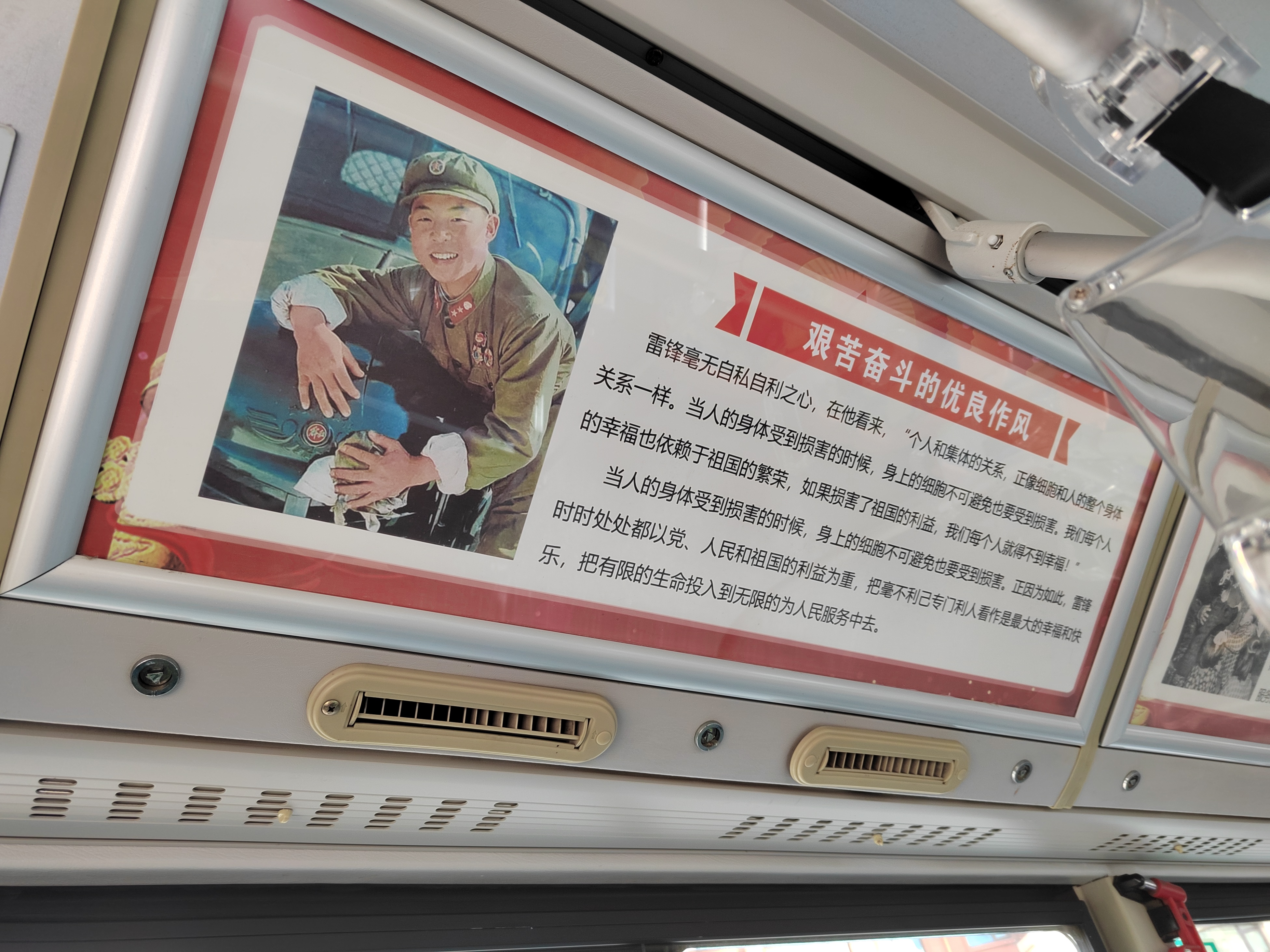 31路公交線全程22個(gè)站點(diǎn),途經(jīng)連云區(qū)主城區(qū)、海濱大道,道路情況復(fù)雜,上下坡道較多,乘客大多數(shù)為海濱大道周邊及連云古鎮(zhèn)居住的老年人。第60個(gè)學(xué)雷鋒紀(jì)念日即將到來,公交集團(tuán)公交事業(yè)二部精心裝扮31路蘇GK8832公交車學(xué)雷鋒主題公交車。車廂外部以“學(xué)習(xí)雷鋒精神 弘揚(yáng)雷鋒精神 爭做時(shí)代先鋒”為主題詞;車廂內(nèi)部從“共產(chǎn)主義戰(zhàn)士 最美奮斗者”“艱苦奮斗的優(yōu)良作風(fēng)”“刻苦學(xué)習(xí)和鉆研理論”“干一行愛一行鉆一行”四大方面宣傳、介紹雷鋒先進(jìn)事跡,弘揚(yáng)雷鋒精神。乘客進(jìn)站臺前,便能遠(yuǎn)遠(yuǎn)地感受到濃厚的學(xué)雷鋒氛圍,感受到31路“與雷鋒車同行海濱大道文明線”車廂里積極向上的紅色底色。