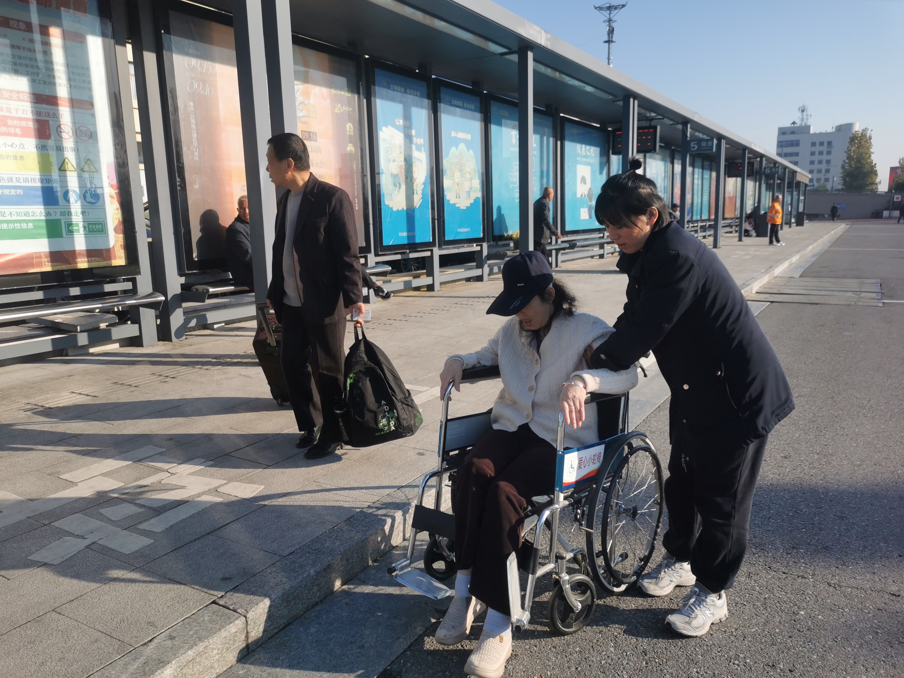 得知老人的困境后,“雷鋒車”驛站的工作人員迅速行動起來,她們一邊安撫老人的情緒,一邊查詢公交班次,為老人提供輪椅手推車送至公交換乘點。在工作人員的細心攙扶下,老人安全地坐上了公交車,并得到了車上乘客的熱心幫助。